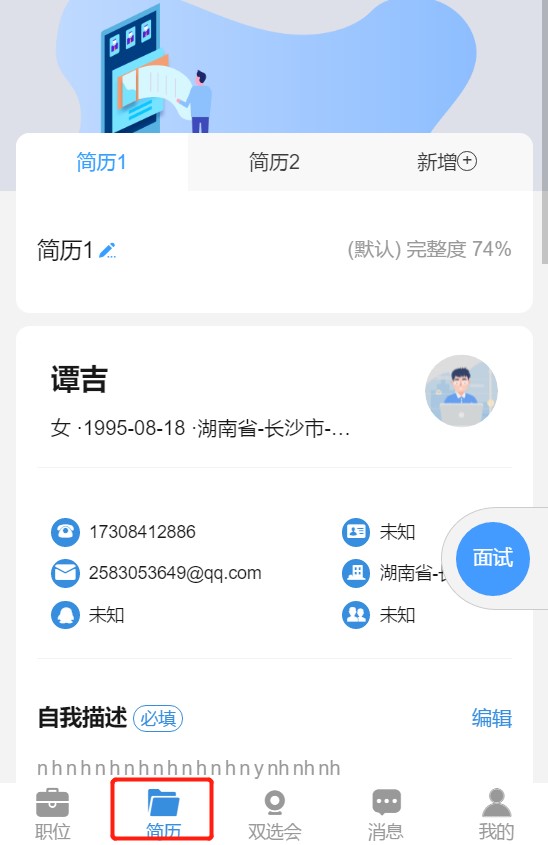 第二步:登录完成后,点击页面底部“简历”按钮,完善简历(简历完整度大于70%才可以报名招聘会),完成简历后,点击页面底部“双选会”按钮,“报名进入会场”进入企业列表页面。