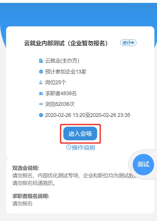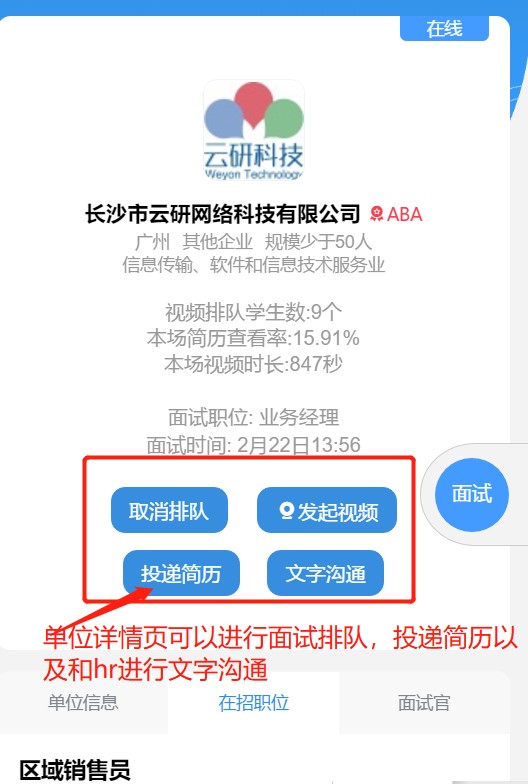 第三步:进入企业列表后,招聘会未召开前,可以点击单位名称查看单位详细信息,并进行简历投递以及可以跟单位进行文字沟通;招聘会召开当天,可以点击单位名称边上的视频按钮以及在职位详情页面,向单位发起面试申请;