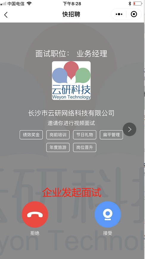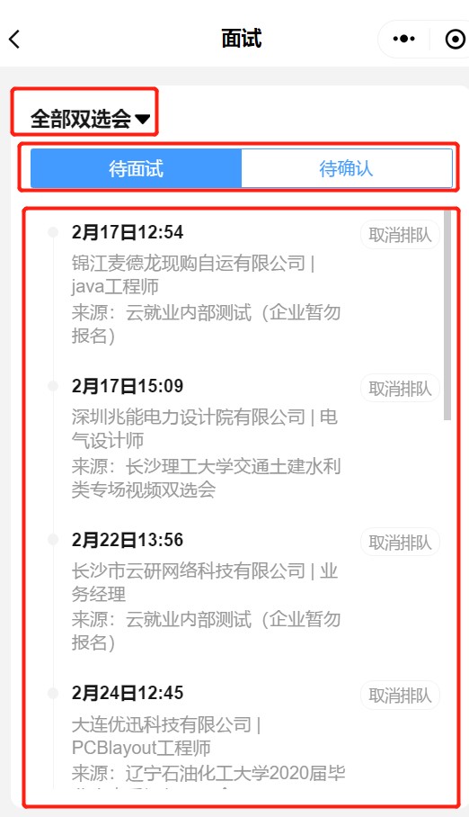 第五步:出现在“待面试”列表的内容,表明企业已经同意进行面试,可以点击详情自主发起面试(企业在线的状态下),也可以等企业发起面试(学生必须在小程序页面才能接受到邀请),面试完成后等待接收企业后期通知即可