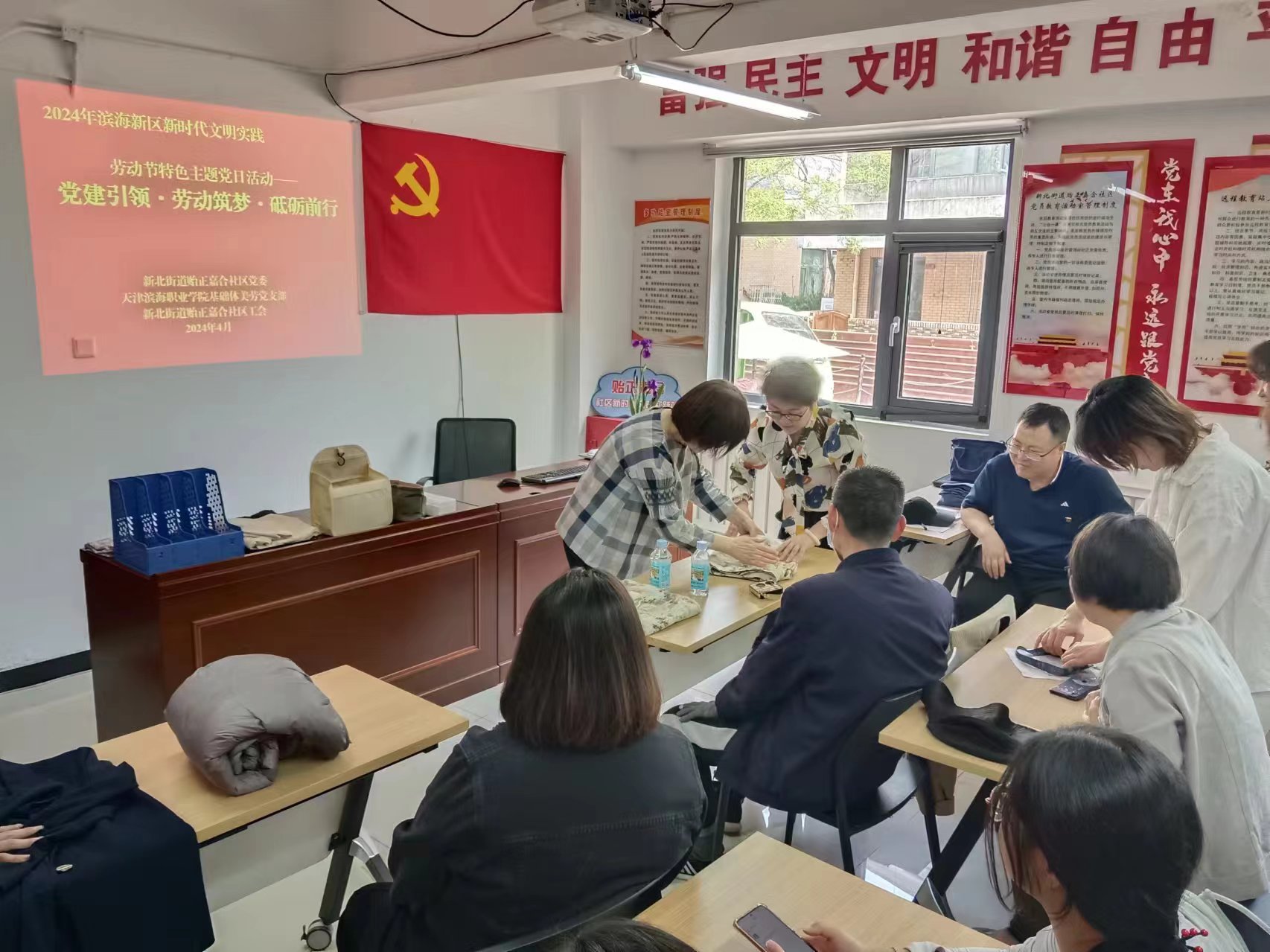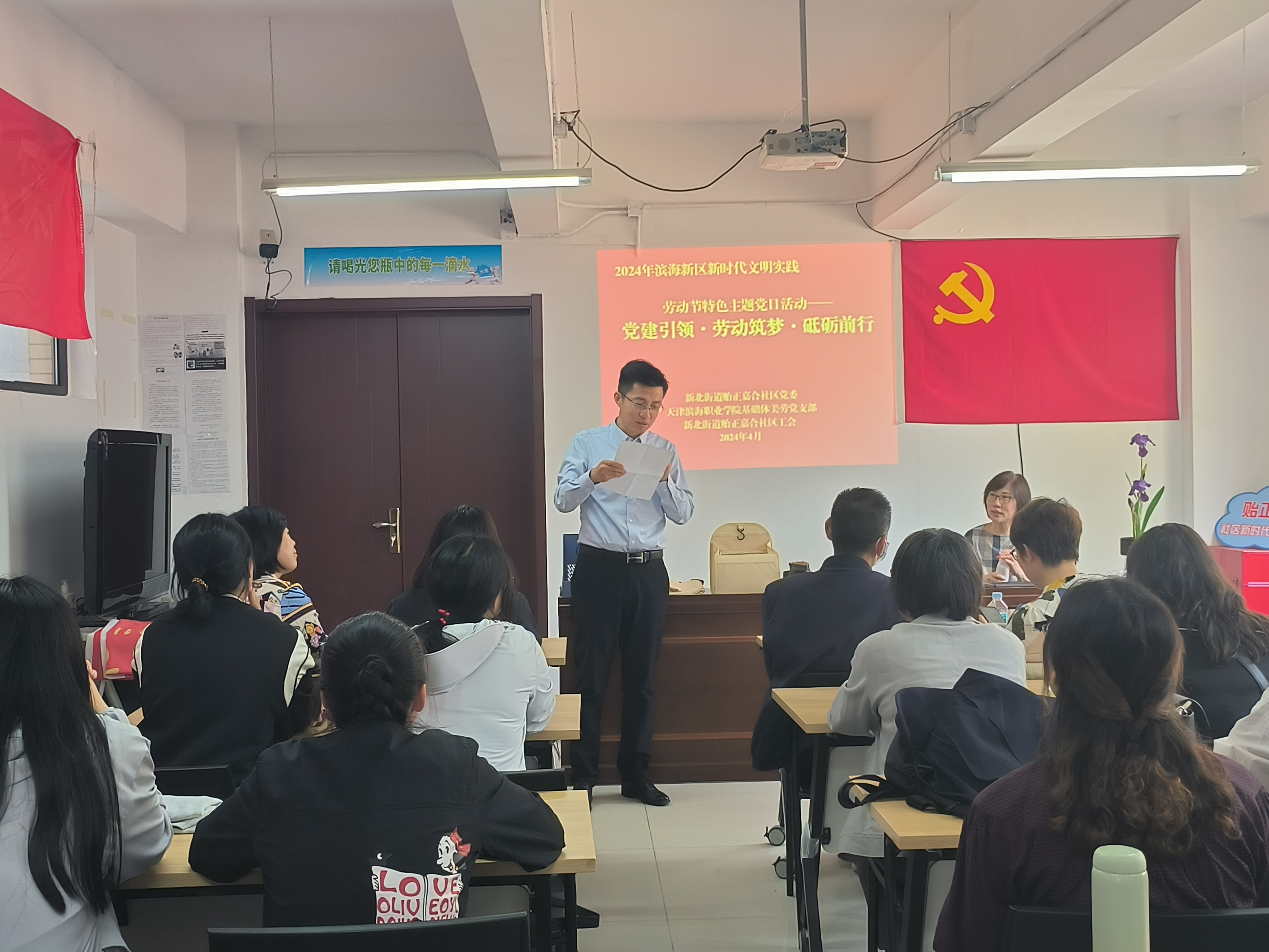 值此2024 年五一劳动节来临之际,4月25日下午,我校体美劳中心和基础教学部来到贻正嘉和社区居民活动中心,开展了以“党建引领·劳动筑梦·砥砺前行”为主题的党日实践活动。基础体美劳党支部全体党员教师和部分学生代表以及社区居民参与了本次实践活动,本次活动由体美劳中心副主任王俊杰主持。此次活动旨在通过党员的先锋模范作用,引领居民热爱劳动,营造劳动光荣的社会风尚和精益求精的敬业风气。