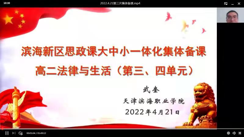 此次针对高中、高职相邻学段思政课法律部分的连续3次集体备课到此圆满结束,无论是主办方还是参与者都从中体会良多。作为滨海新区大中小学思政课一体化教学研究联盟牵头单位,我们将会在组织好自身思政课教学的基础上,尽己所能继续推动新区思政课一体化教学工作,大家共学、共促、共成长。