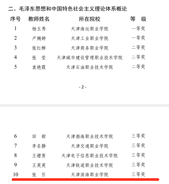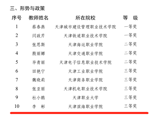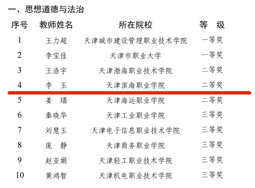 日前,天津市高职院校思政课协同创新中心揭晓第四届天津市高职院校思政课教师教学“比武”结果,“比武”活动经各学校层层选拔,通过初赛、复赛、决赛三个阶段,最终经过激烈地角逐,我校马克思主义学院李玉老师荣获思想道德与法治课二等奖,张引老师荣获毛泽东思想和中国特色社会主义理论体系概论课三等奖,李彬老师荣获形势与政策课三等奖。