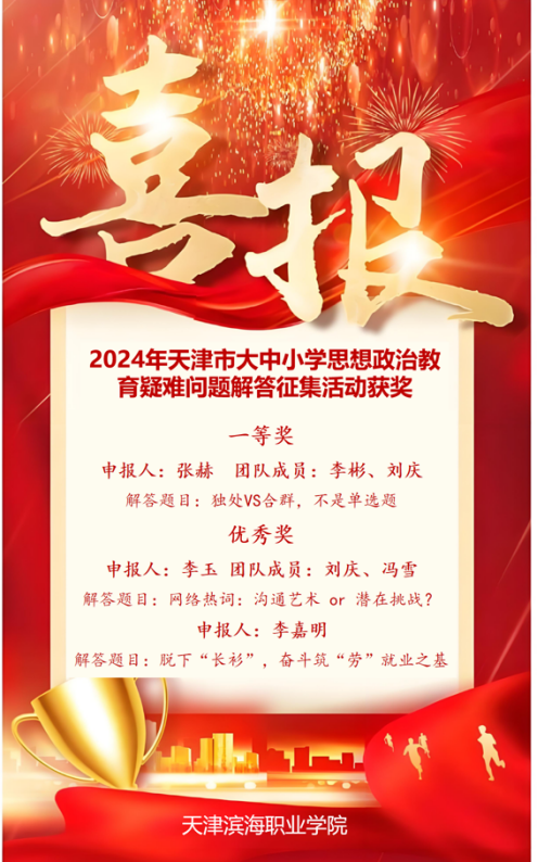 为深入贯彻习近平新时代中国特色社会主义思想和党的二十大、二十届三中全会精神,按照市教育两委的通知要求,我校积极开展本年度“天津市大中小学思想政治教育疑难问题解答征集活动”,经专家评审后择优推荐,我校3组教师的投稿作品获奖,其中,一等奖1名,优秀奖2名。