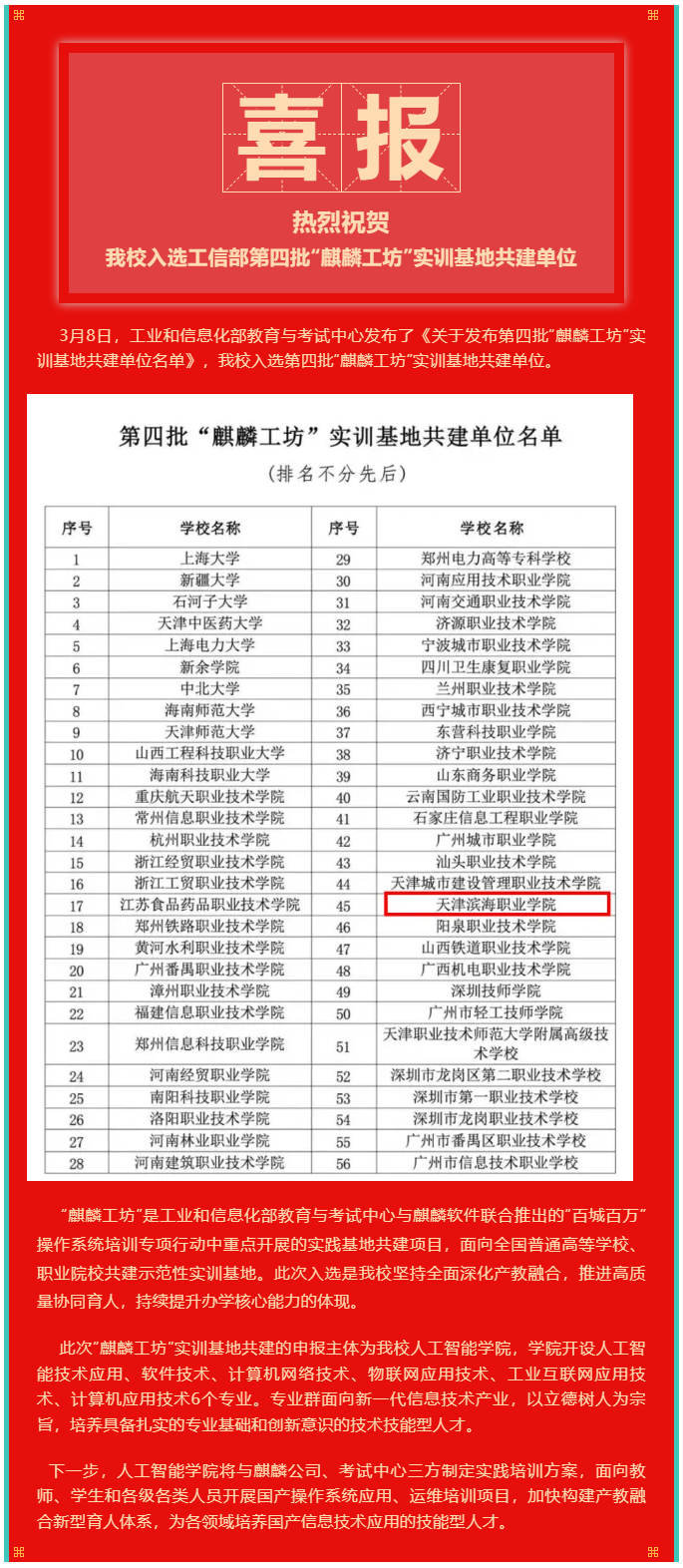 喜报!我校入选工信部第四批“麒麟工坊”实训基地共建单位 来源:本站原创 发布时间:2024-03-18 11:38:26 浏览次数: 次 【字体:小 大】 终审:rgznxysh2 分享到: 【打印正文】