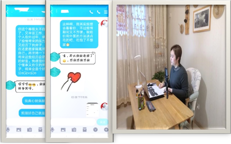 信息工程系辅导员白晨曦老师班内一名同学假期没有回家选择留津打工,做天津地铁安检员,站点邻近发热门诊医院,在白老师反复耐心的开展思想工作后,这名同学辞去了工作,但是因所租房屋其他租客的原因,依然被居家隔离14天,真是一波三折。白老师每天通过网络和电话沟通安抚和疏导学生的情绪,并为学生通过无接触外卖的方式送去食物,舒缓学生隔离期间想家的情绪,努力为学生带去家的温暖。