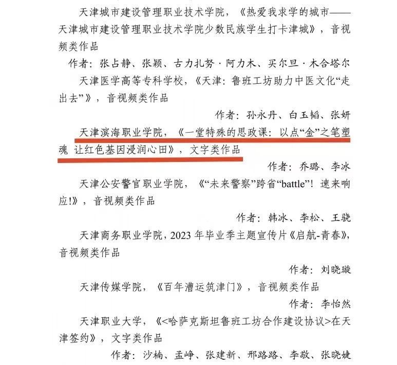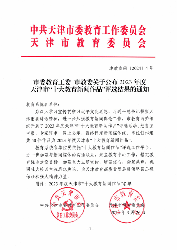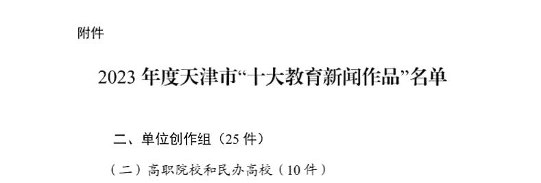 日前,由市教育两委组织开展的2023年天津市“十大教育新闻作品”评选结果公布。经过自主申报、专家评审、网上公示,最终评定新闻媒体组、单位创作组共50件作品。我校报送的《一堂特殊的思政课:以点“金”之笔塑魂 让红色基因浸润心田》文字类新闻作品入选单位创作组“十大教育新闻作品”。