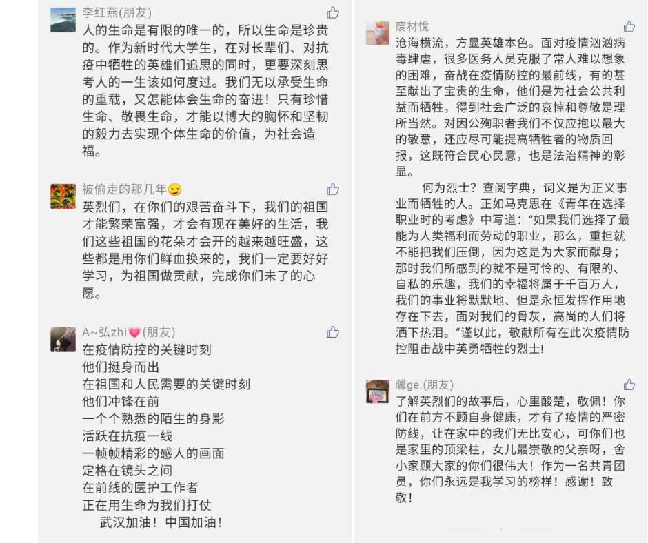 新冠肺炎疫情防控期间,我们积极倡导通过居家追思、网上云端祭祀的方式来怀念逝者、寄托哀思,将中华民族慎终追远的情感,融入现代文明的表达方式,变实地实物祭扫为注重精神传承,营造文明祭扫的社会氛围。许多老师和同学都在留言中表达了自己对英雄先烈的敬仰缅怀之情。