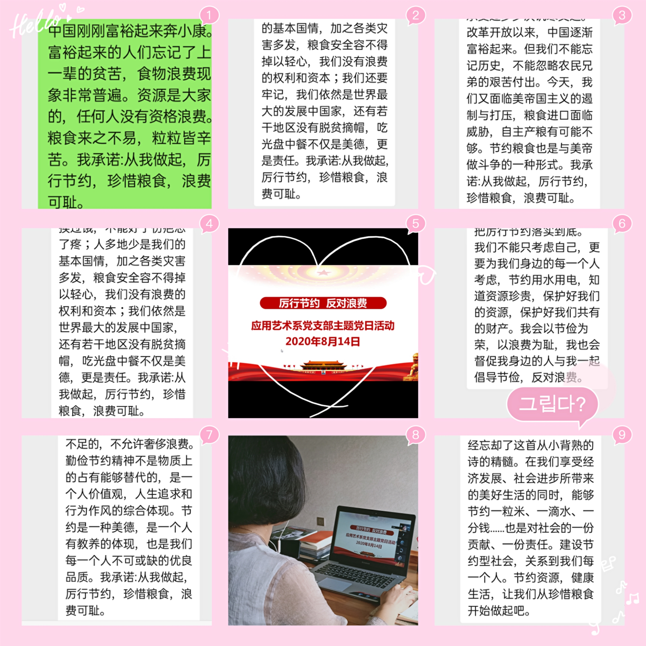 习近平总书记一直高度重视粮食安全和提倡“厉行节约、反对浪费”的社会风尚,多次强调要制止餐饮浪费行为。2020年8月14日,应用艺术系党支部全体党员教师开展线上党日活动,学习了人民日报客户端《厉行节约!习近平要求坚决制止这种行为》、学习强国平台《跟着总书记一起拒绝“舌尖上的浪费”》、人民日报《说到做到!拒绝餐饮浪费36字承诺》等文章。