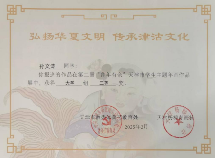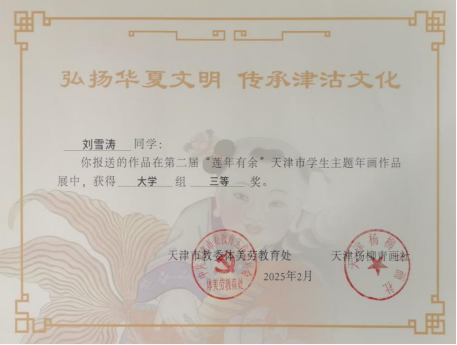 近日,由天津市教育委员会与杨柳青年画社携手举办的第二届“莲年有余”天津市学生主题年画作品展圆满结束。本次活动共征集到来自全市16个行政区域的598所中小学及38所高等院校精心创作的9068件作品。经过专家评审团的严格筛选,我校报送的5幅年画作品在大学生组参赛作品中脱颖而出,最终荣获一等奖1项、二等奖2项及三等奖2项的佳绩。