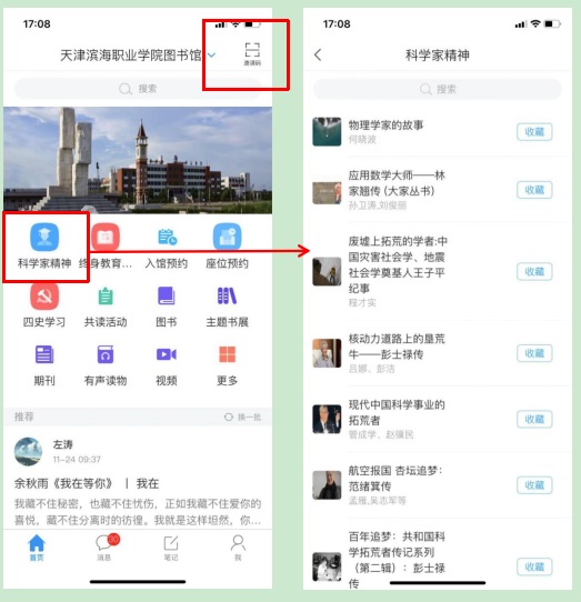 2、下载并使用手机号注册,首页点击右上角“邀请码”输入“tjbhxytsg”,进入图书馆主页面。在主页面点击“科学家精神”模块进入学习页面。