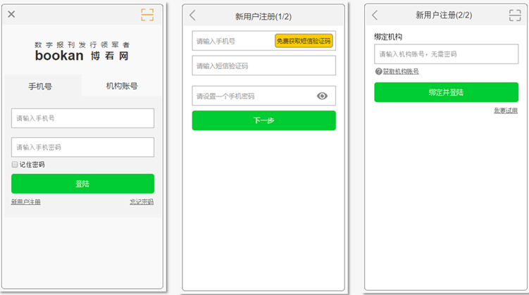 首次登录博看网用户,需在扫描书后面的二维码后,点击新用户注册,输入手机号,设置密码,绑定乐竞(中国)一站式体育服务图书馆机构账号:bhzylib。