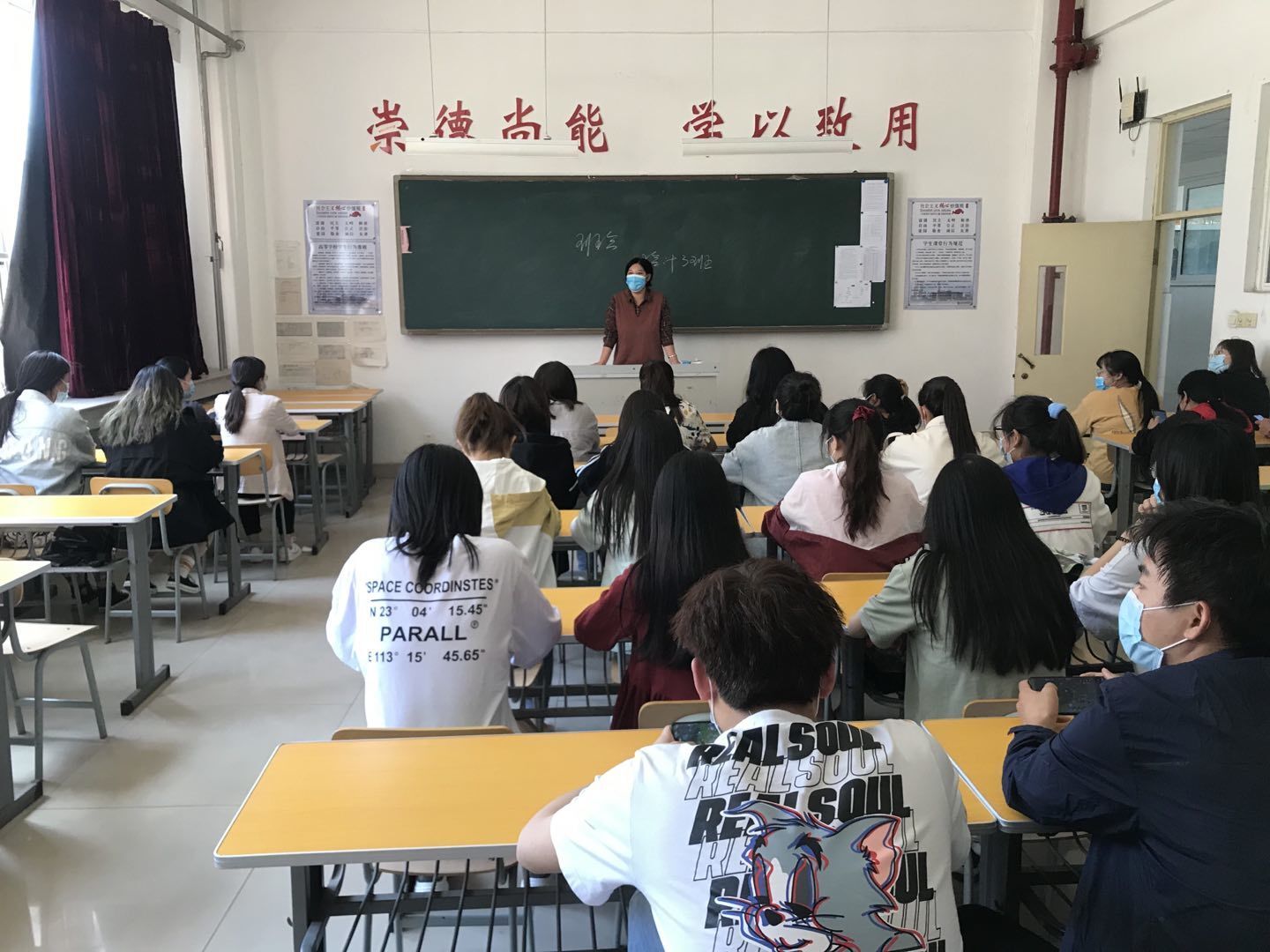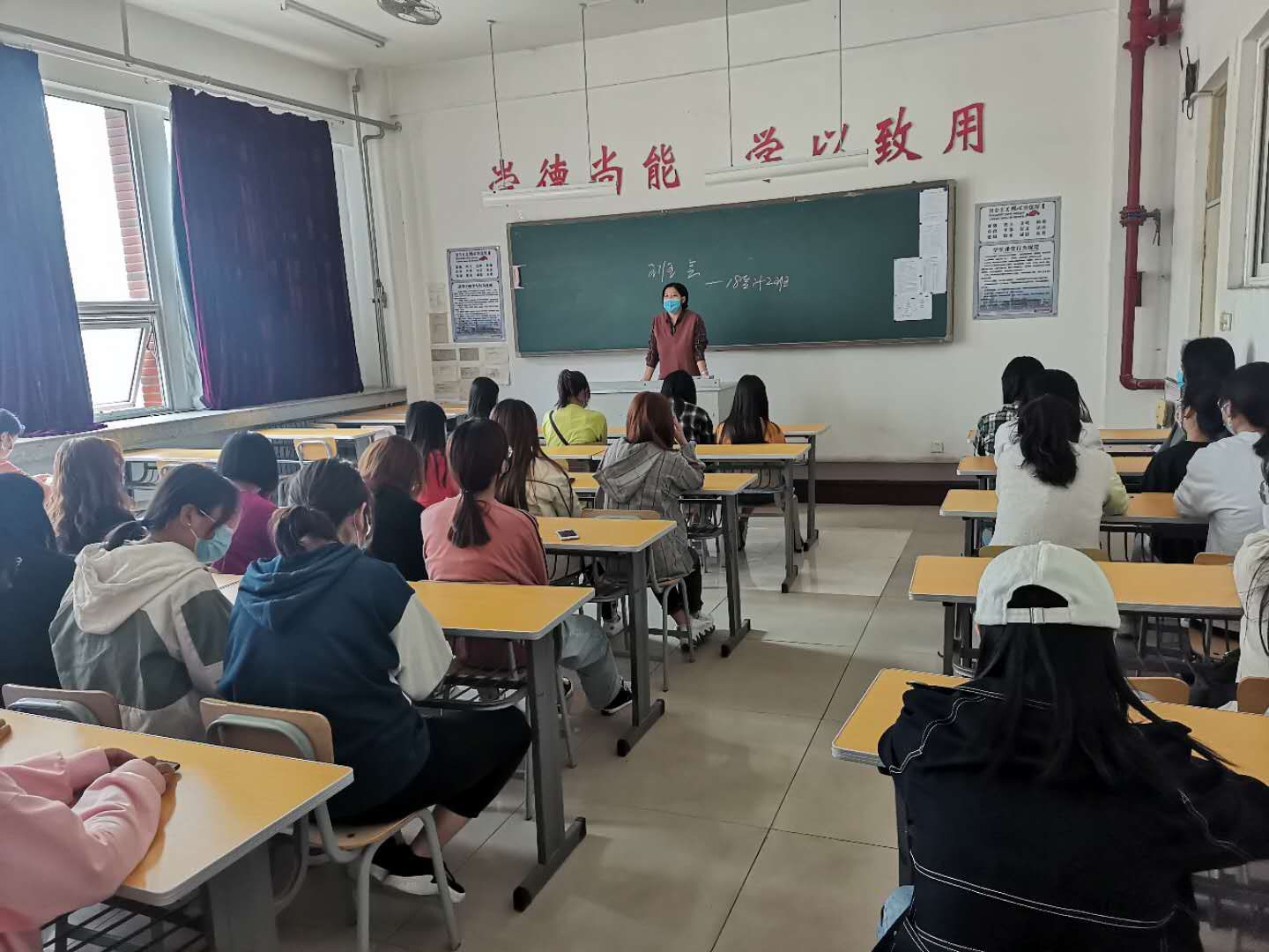 辅导员李老师对学生们进行了疫情防控知识讲解,还对现在抗击疫情形势的严峻性做了说明,倡导同学们在校内不聚集,提高防护意识,积极锻炼身体,营造干净的宿舍环境、教室环境。