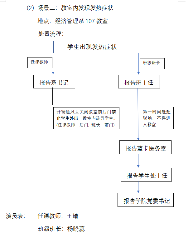 应急演练前,徐公仁副书记上午首先在107教室召开了乐竞官网复课开学相关防疫文件学习的会议,详细解读了《乐竞官网新型冠状病毒感染的肺炎疫情防控工作预案》,带领全系坐班教师重点学习了晨午检工作方案、消杀与通风方案、发热人员应急处置工作流程等相关文件;会后,支部委员团总支书记闫亚萍制定了系部应急工作流程图,进一步细化了防控措施,制定了演练场工作安排,从而确保演练的顺利进行。