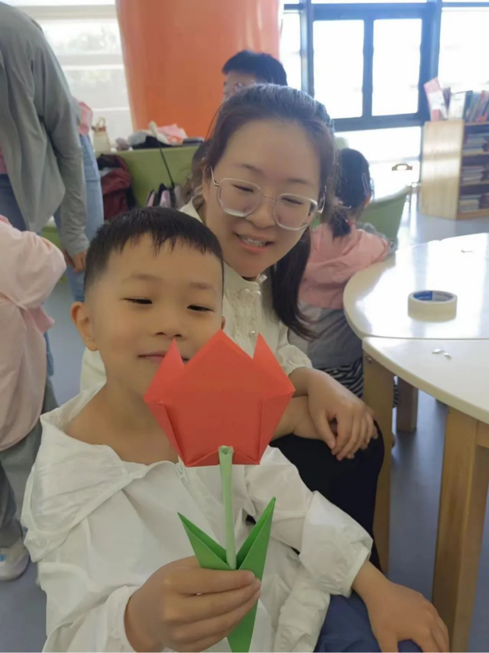 除了绘本讲述外,学前教育学生为幼儿和家长设置了互动环节。幼儿在学生和家长的指导下,动手制作了母亲节礼物—郁金香折纸,将自己的祝福和感激之情融入其中。幼儿充分发挥自己的动手能力同家长一起传递幸福。