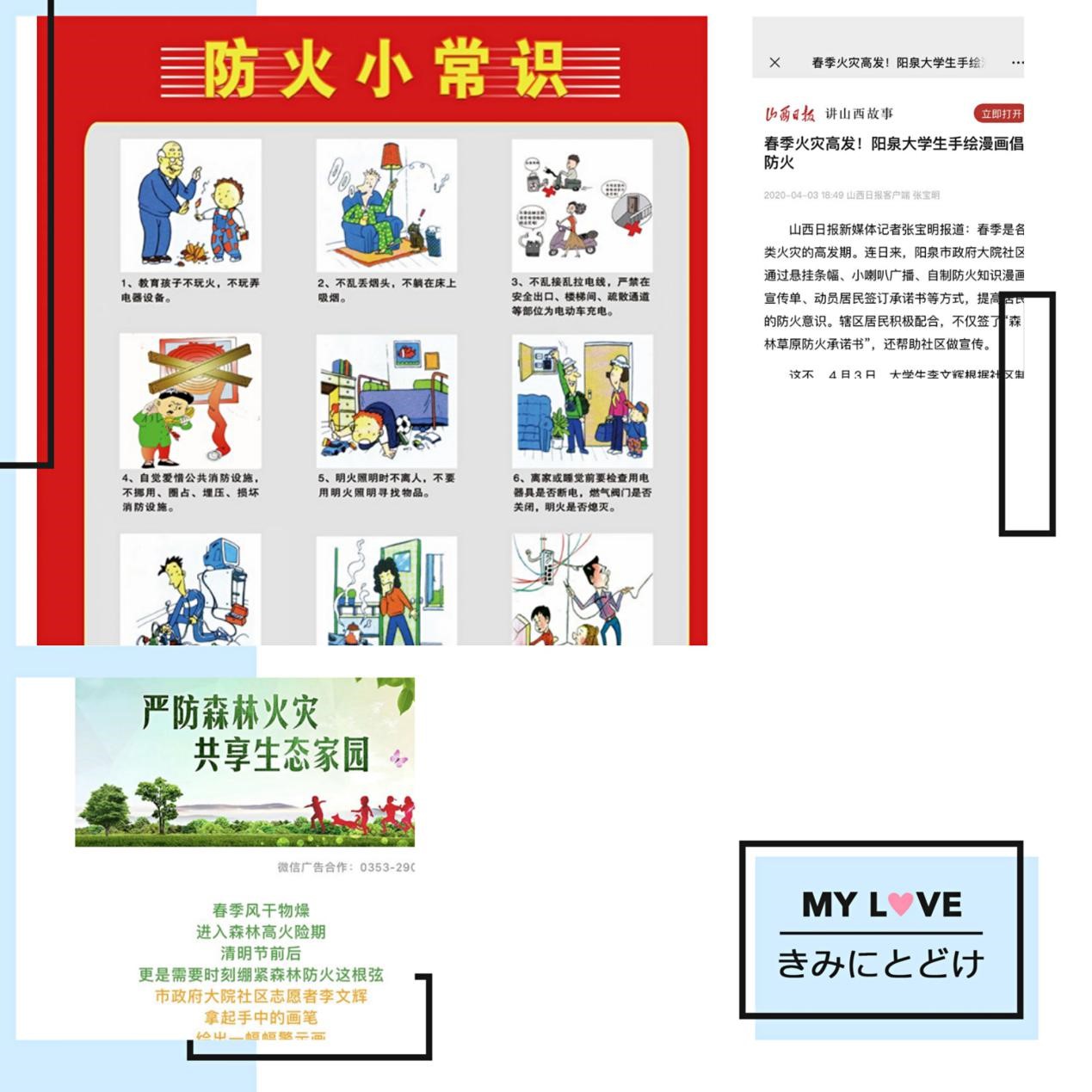 适逢春季火灾多发季节,他在完成繁重的日常网课学习任务之余,利用业余时间手绘了一组宣传消防知识的漫画,讲解生活中的安全用火、用电等常识,惟妙惟肖的作品受到社区群众的一致喜爱和好评,他的绘画作品被印制成宣传画张贴在阳泉的大街小巷,为当地的消防宣传事业做出了贡献。