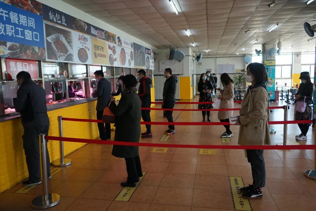 老师们间隔排队进入食堂