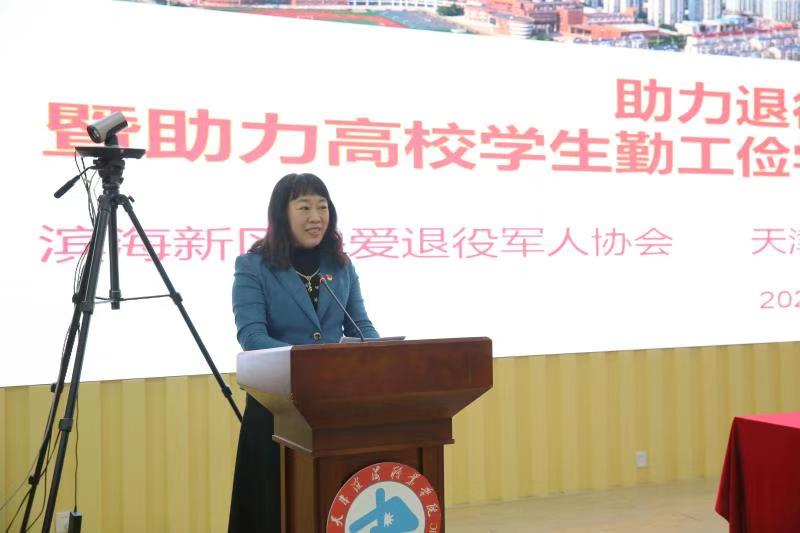 随后,刘雁红书记代表学院对滨海新区退役军人事务局、关爱退役军人协会、滨海新区纸鑫科技有限公司为乐竞(中国)一站式体育服务在校家庭经济困难大学生设立扶困奖优项目并提供勤工岗位,助力青年学生成长成才表达了诚挚谢意。刘书记在致辞中还回顾了几年来,学院在双拥工作、退役军人安置工作、退役士兵再就业培训等方面做出的努力和取得的成绩,作为滨海新区唯一一所高校,学院今后将继续整合优势资源,为滨海新区退役军人事业的发展做好保障工作。