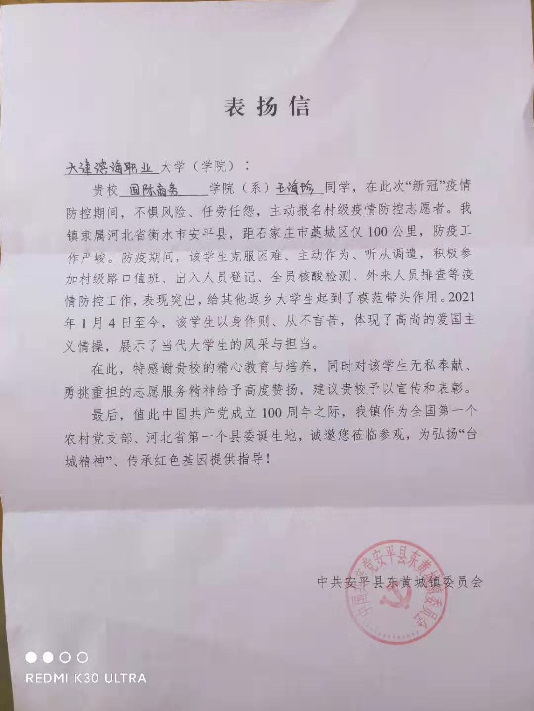 防疫期间,王海珍同学听从调遣、从不言苦,积极参加村级路口值班、出入人员登记、全员核酸检测、外来人员排查等疫情防控工作,在近50天的时间里,以身作则、任劳任怨,用行动给其他返乡大学生做出良好的示范和表率,更体现了高尚的爱国主义情操,展示了乐竞(中国)一站式体育服务大学生的风采与担当。志愿服务结束后,安平县东黄城镇委员会专门向学院发来了表扬信,感谢学院对王海珍同学的教育和培养。