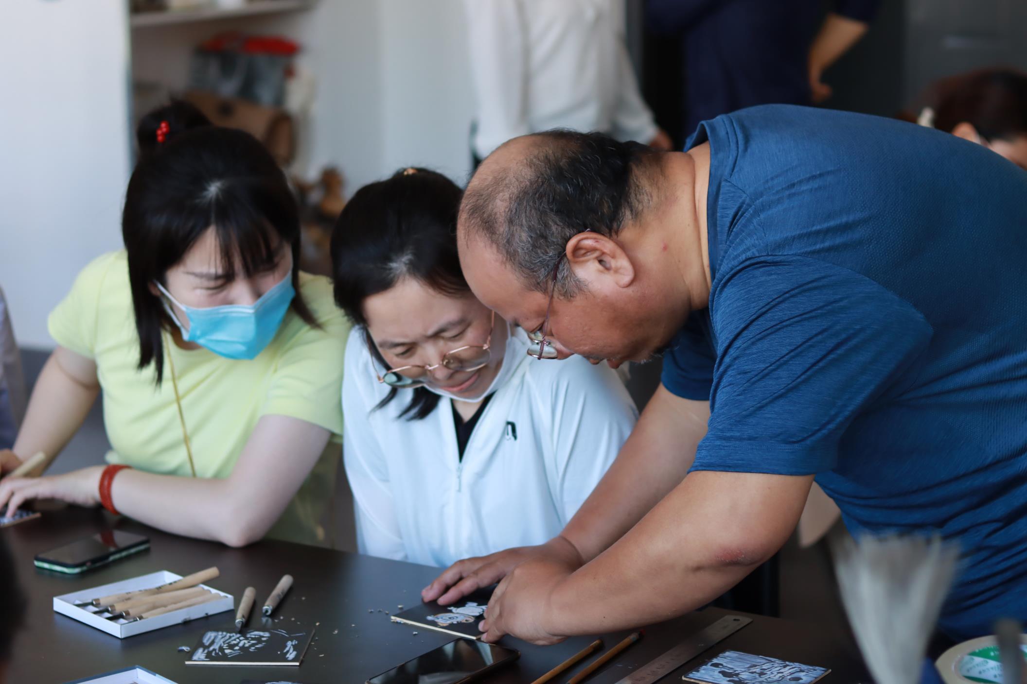 侯金利老师介绍了版画制作的流程、各种工具的运用方法。来宾们参观了版画工坊中陈列的师生画作以及制作版画的设备。在基本了解了版画这门艺术后,指导老师给每位嘉宾分发了画板,大家手拿刻刀,在备版上精雕细琢,指导老师对大家在创作过程中提出的问题进行耐心的解答。一个多小时的版画制作体验,令大家兴趣盎然,意犹未尽。