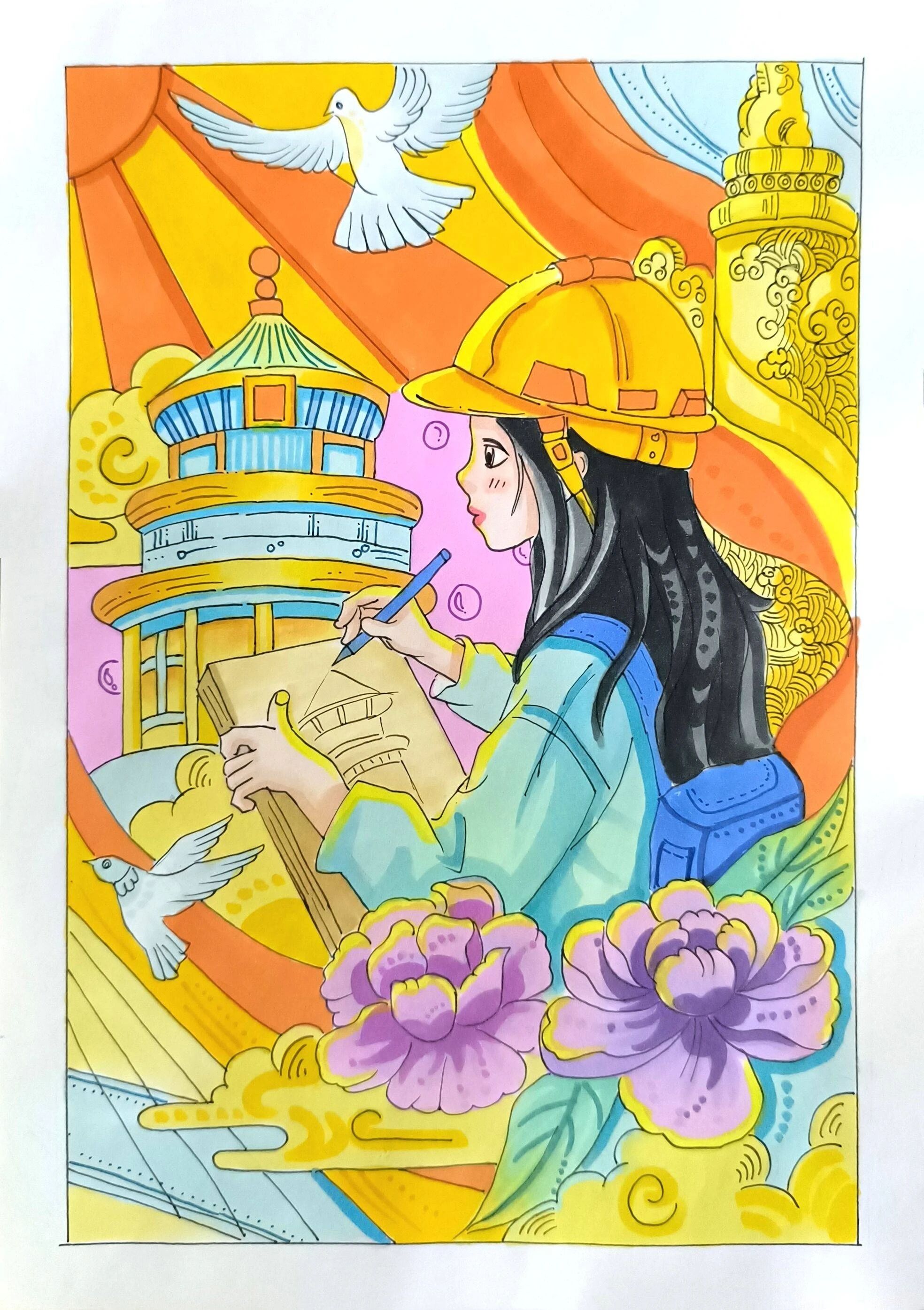 24造价1班李睿颖:七一建党节,是党的诞辰,也是全体中华儿女共同铭记的光辉节日。对于建筑人而言,这个节日有着特殊的意义。在这幅色彩绚烂的画作中,一位头戴安全帽的学生正在专业实践,专注地在图纸上绘制建筑设计图,象征着广大建筑工作者的拼搏与奉献,象征着一代又一代的建筑人用一砖一瓦、一梁一柱,书写着时代的篇章。
