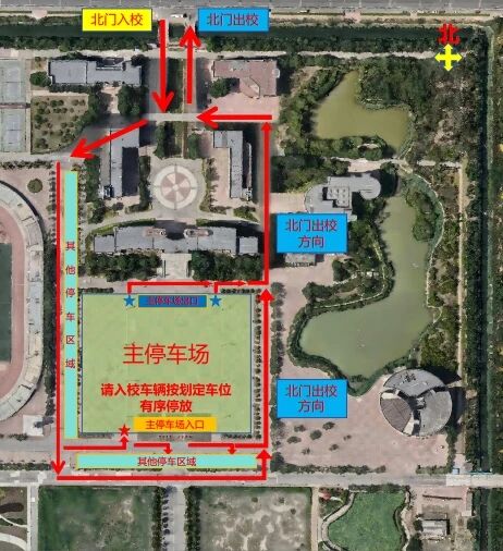 报到当天家长可驾车进入学校,因入校车辆众多,所有车辆均需从学校北门入校,北门出校,行人可以从东门进出,所有标注线路,均为单行线路,请家长朋友知晓,如遇车流高峰,请新生家长朋友耐心等待,感谢您的配合。
